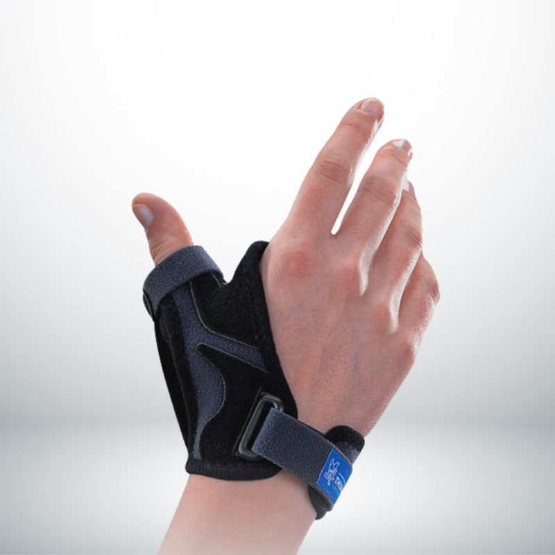 RhizoImmo est une orthèse de stabilisation du pouce qui offre un soutien et une stabilisation en cas de rhizarthrose et de lésions du pouce. Grâce à l'armature métallique, l'articulation du pouce est maintenue en position neutre, tandis que la conception générale permet les mouvements de préhension et de pincement ainsi que l'amplitude des mouvements du poignet.